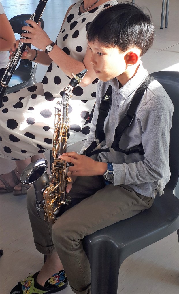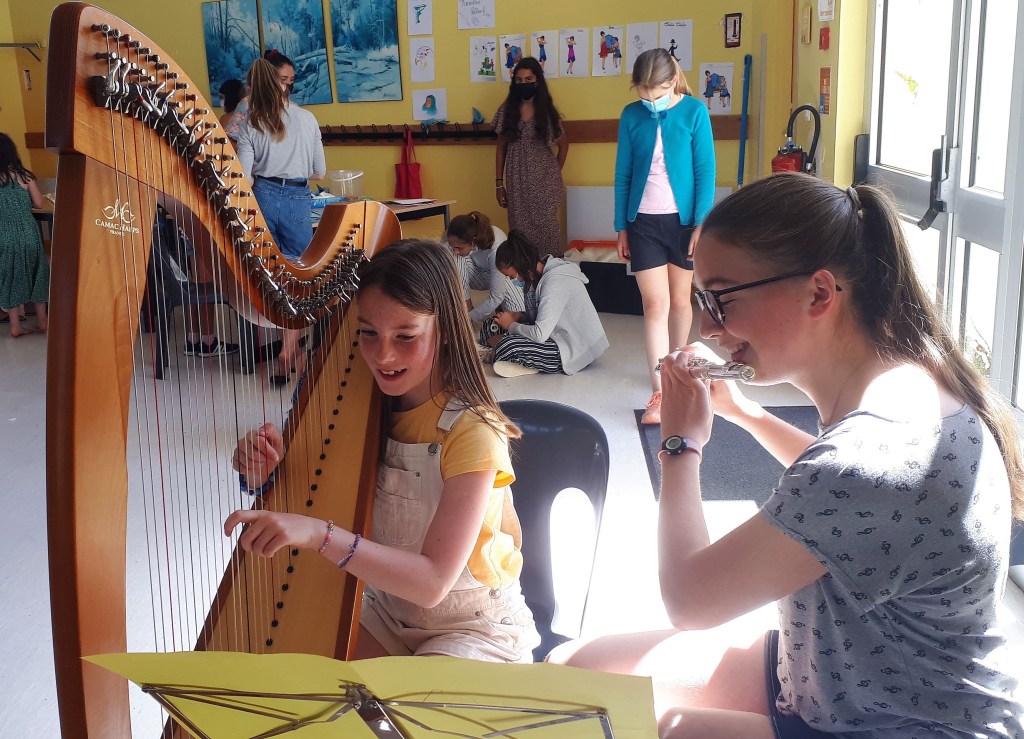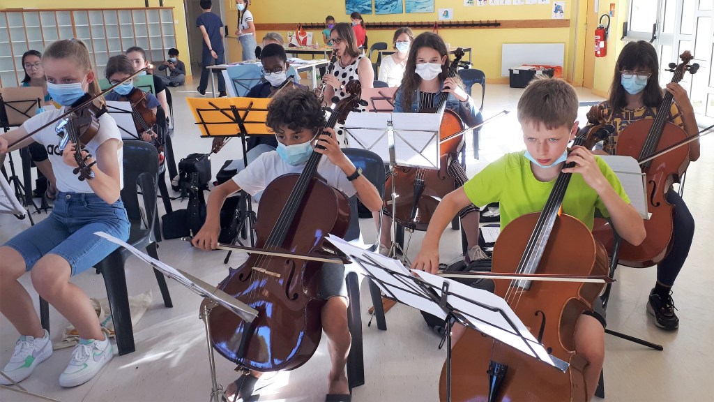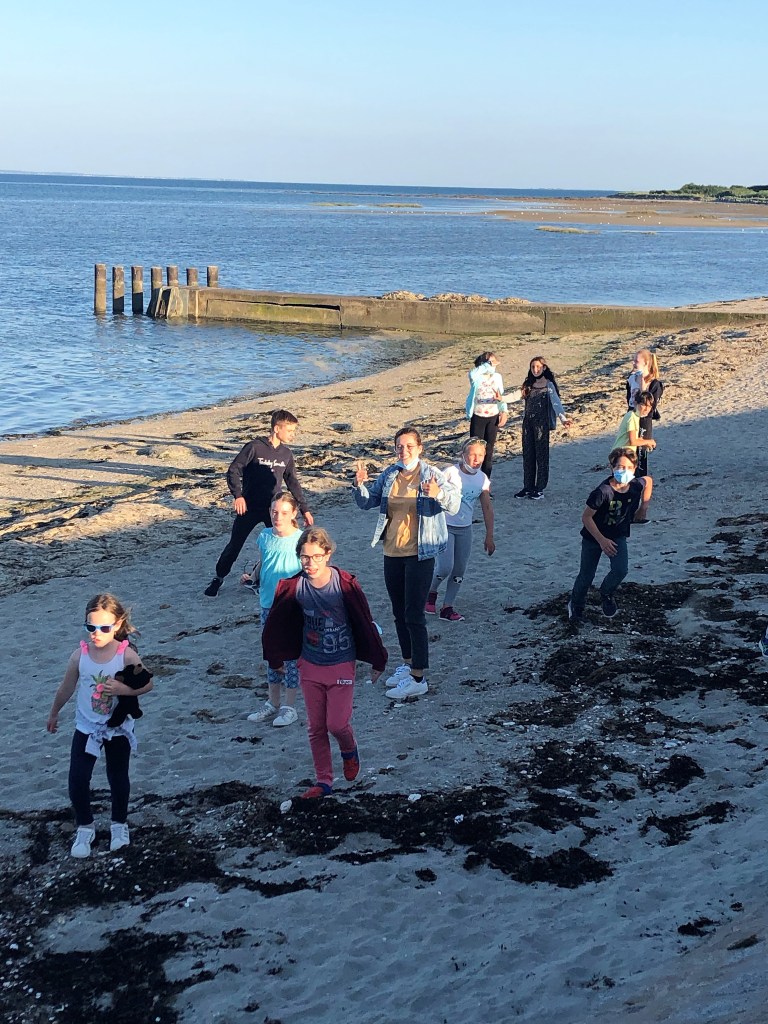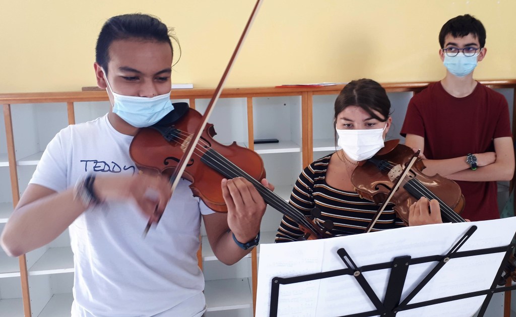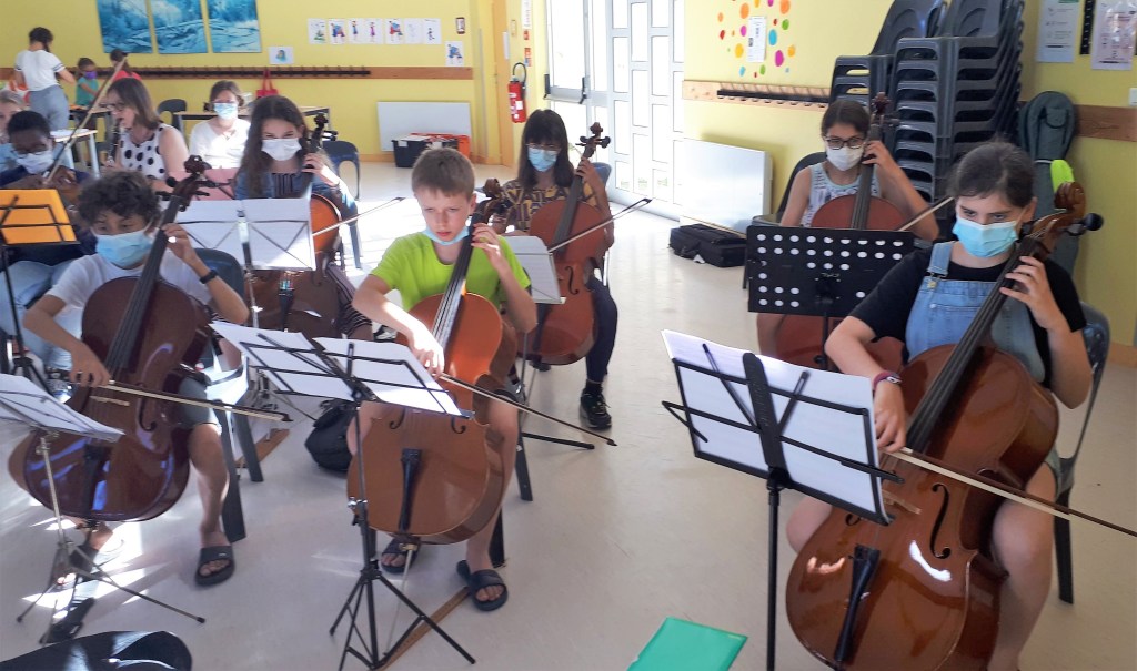 Jeux sur la plage en début d’après-midi puis fin d’après-midi studieuse. Premier tutti d’orchestre. Après presque deux ans sans pratique collective, on est tous heureux de rejouer ensemble !