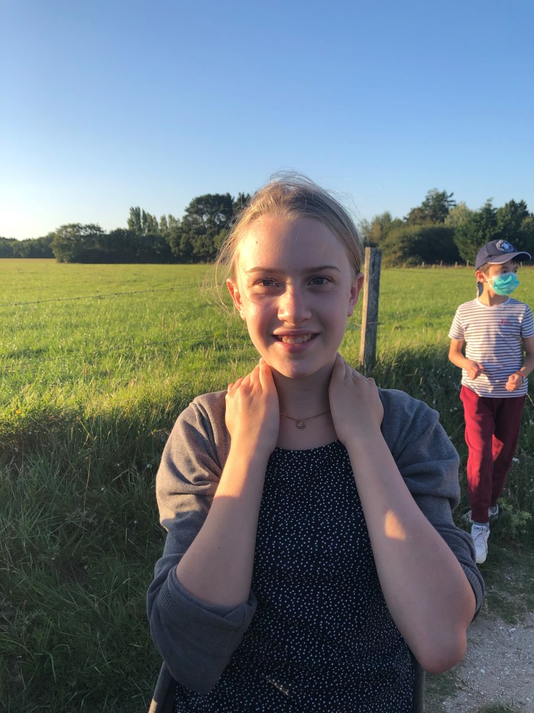 Le temps est au beau fixe, température de 28 °. Nous prenons tous les repas sur la terrasse. Jeudi midi, poulet frites !