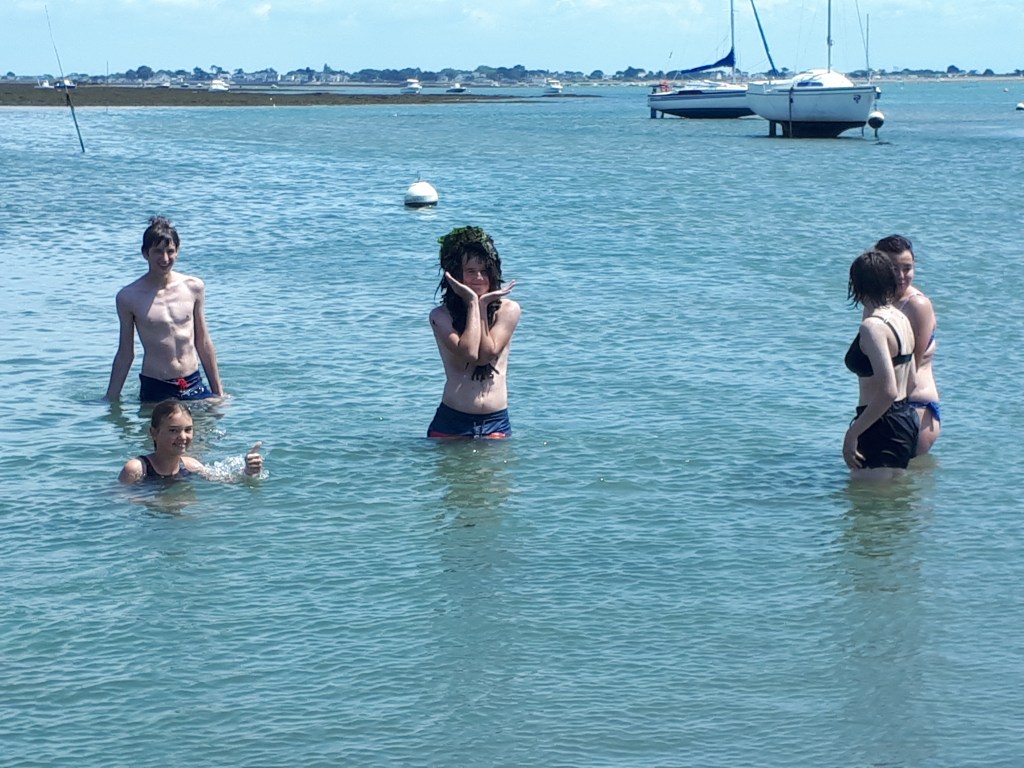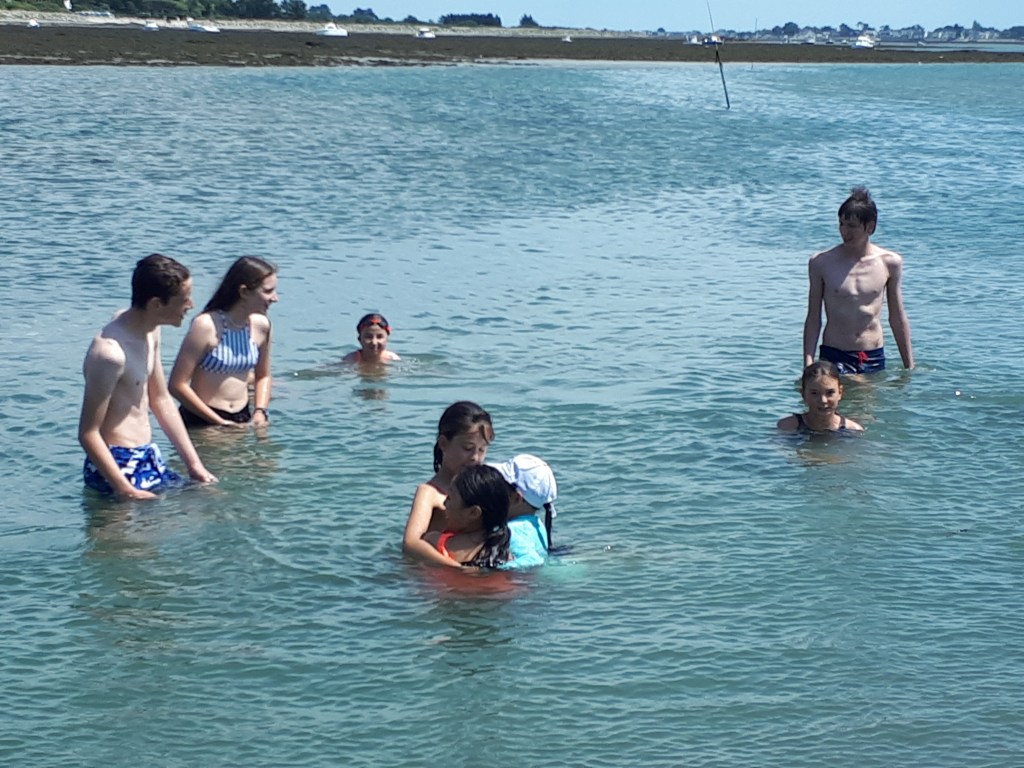 Aujourd’hui, après une matinée studieuse, nous profitons d’une fenêtre météo favorable pour tenter une après-midi plage. Hélas, la Bretagne est soumise aux marées, et la mer était basse … Les enfants ont tout de même passé un bon moment entre concours de perruques d’algues, baignade et glace sur la plage.