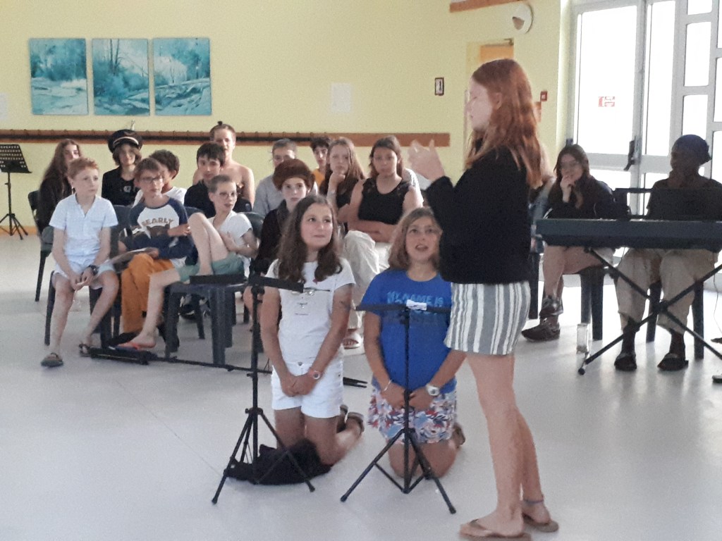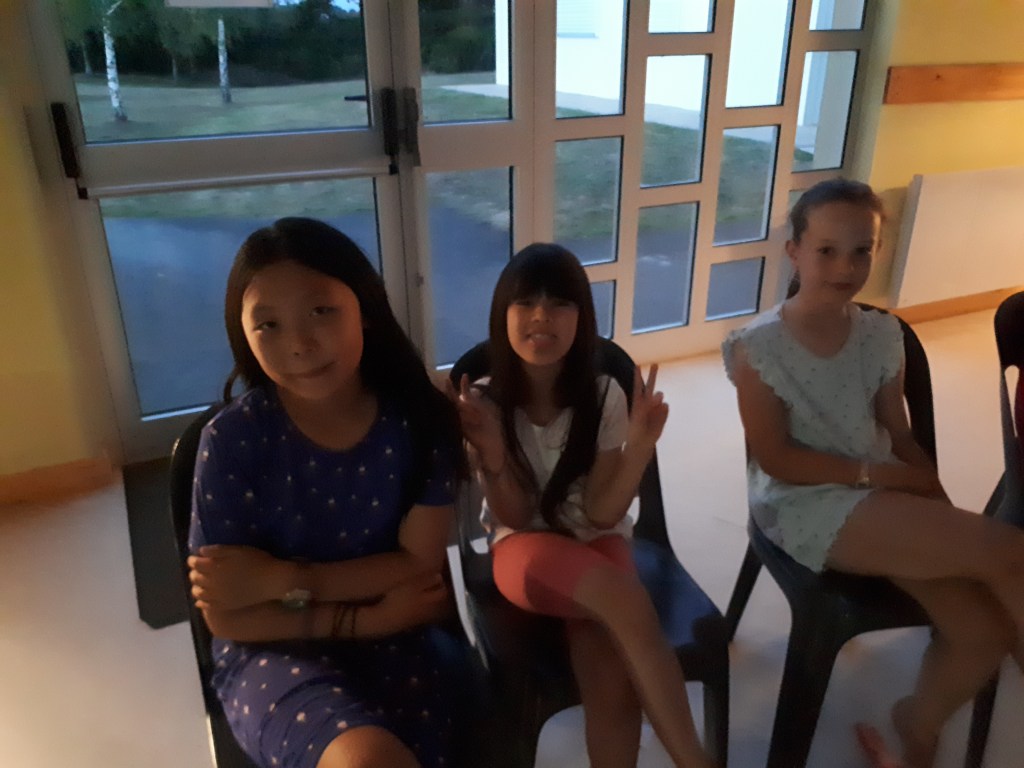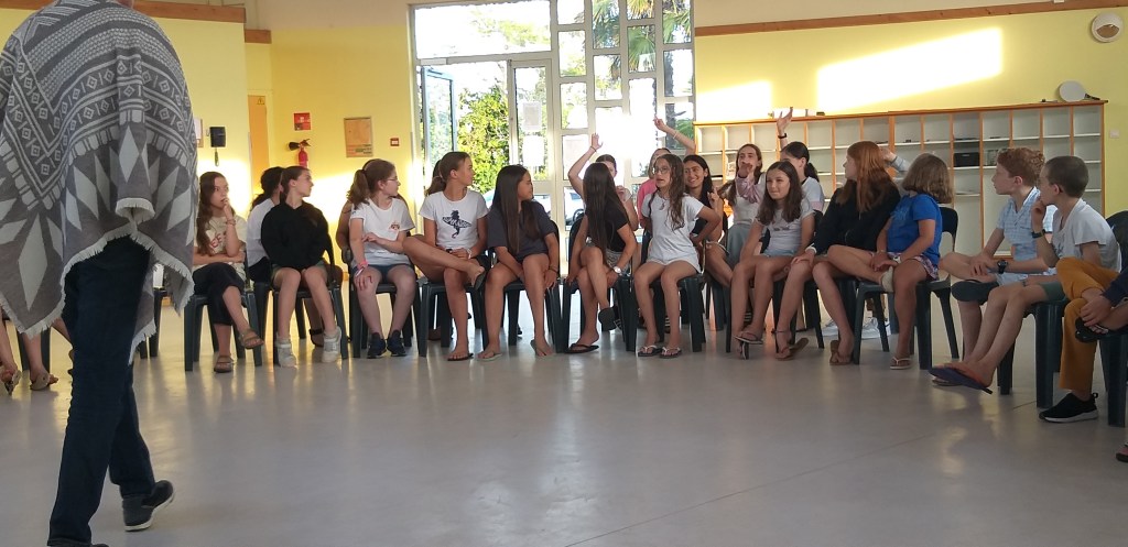 Hier soir, soirée théâtre. Par équipe, les stagiaires, devenus scénaristes, ont 30 minutes pour inventer de toutes pièces une saynète à partir 8 mots tirés au hasard. Ils interprètent leur création devant le « Terrible Jury » composé des professeurs. Les numéros se succèdent avec humour et vivacité. Le jury, impressionné par ce déploiement d’imagination, félicite les acteurs en devenir… Bravo à l’équipe des Mojitos, des Mecs et des Croivébatons.